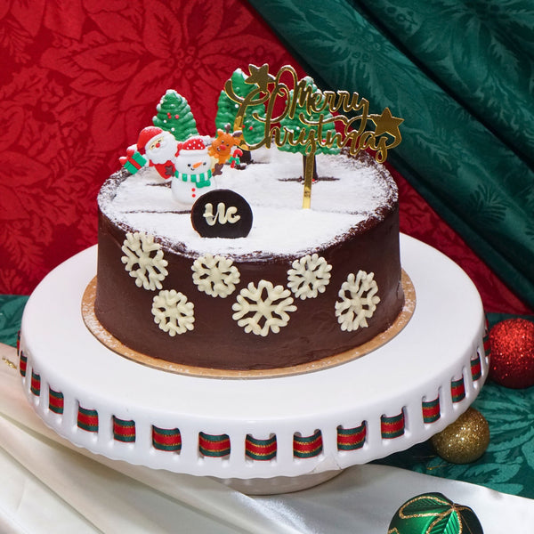 A rich dark chocolate cake covered in silky chocolate ganache and finished with an edible Christmas tree for a festive holiday glow.