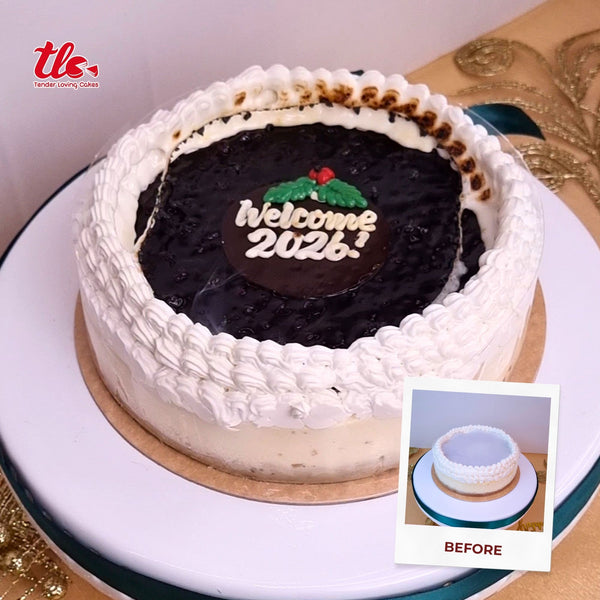 A cheesecake with blueberry flavors, offering a balance of creamy and fruity notes. Finished with whipped cream frosting and a burn-away topper that reveals 2026.