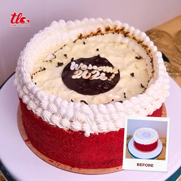 Soft and moist red velvet layers with a balanced cocoa flavor, finished with whipped cream frosting and a burn-away topper that reveals 2026.